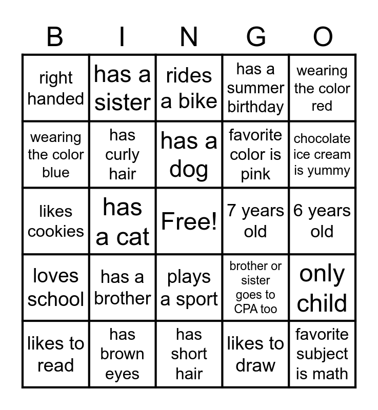This bingo card has a free space and 24 words: has a brother, has brown eyes, has a dog, likes to read, wearing the color red, right handed, wearing the color blue, has a sister, 7 years old, plays a sport, favorite color is pink, likes cookies, brother or sister goes to CPA too, only child, has curly hair, likes to draw, 6 years old, rides a bike, chocolate ice cream is yummy, has a cat, favorite subject is math, loves school, has a summer birthday and has short hair.