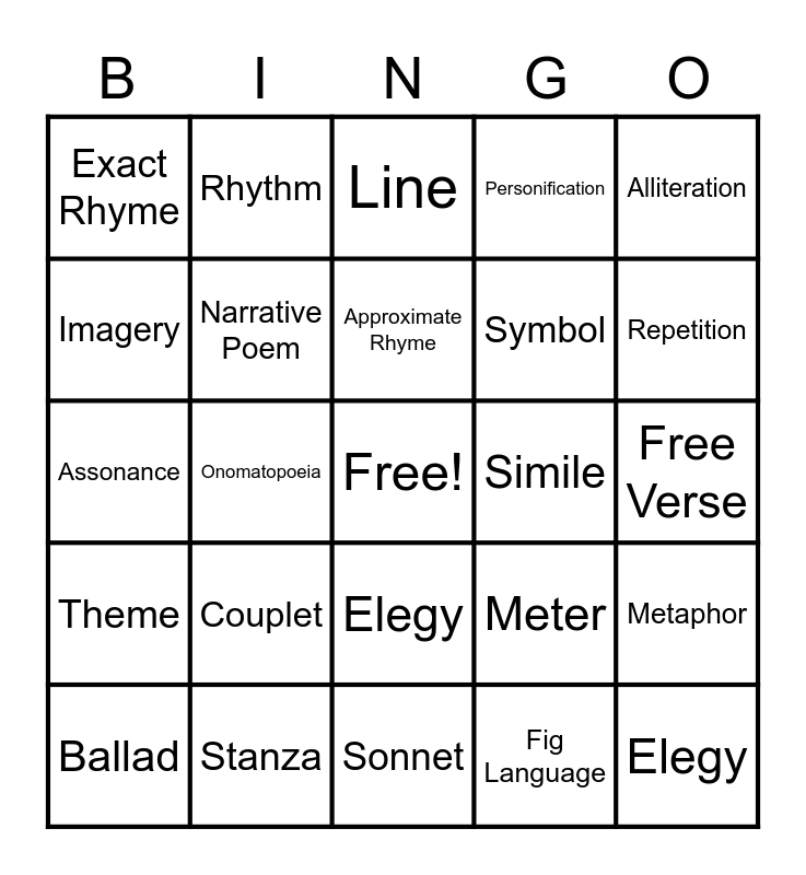 This bingo card has a free space and 24 words: Couplet, Stanza, Approximate Rhyme, Ballad, Alliteration, Exact Rhyme, Imagery, Rhythm, Simile, Elegy, Symbol, Assonance, Meter, Metaphor, Narrative Poem, Fig Language, Free Verse, Line, Repetition, Onomatopoeia, Elegy, Theme, Personification and Sonnet.