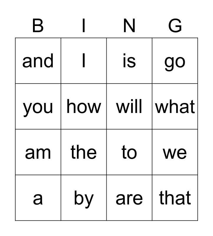 This bingo card has 18 words: the, that, is, and, to, go, a, I, what, am, are, you, we, how, will, there, by and where.