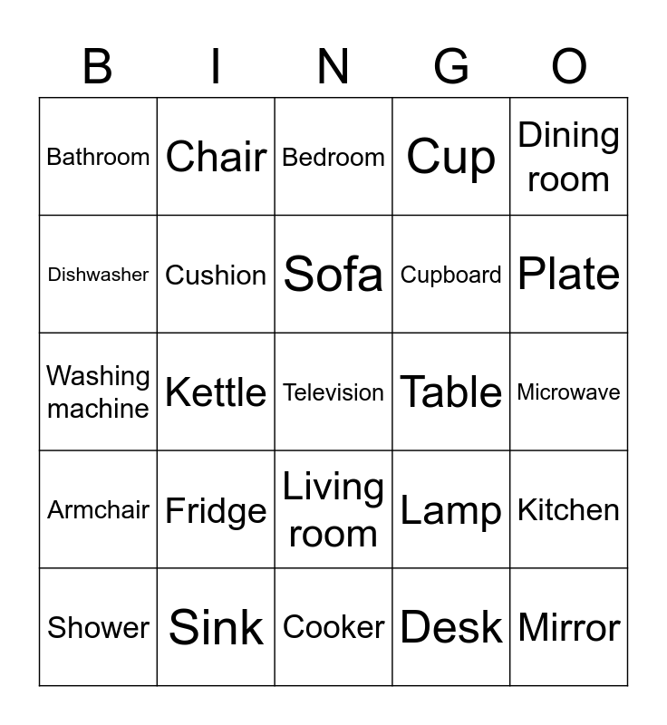 This bingo card has a free space and 24 words: Fridge, Sink, Sofa, Shower, Dining room, Bathroom, Dishwasher, Chair, Table, Living room, Cupboard, Washing machine, Lamp, Kitchen, Cushion, Desk, Microwave, Bedroom, Plate, Kettle, Mirror, Armchair, Cup and Cooker.