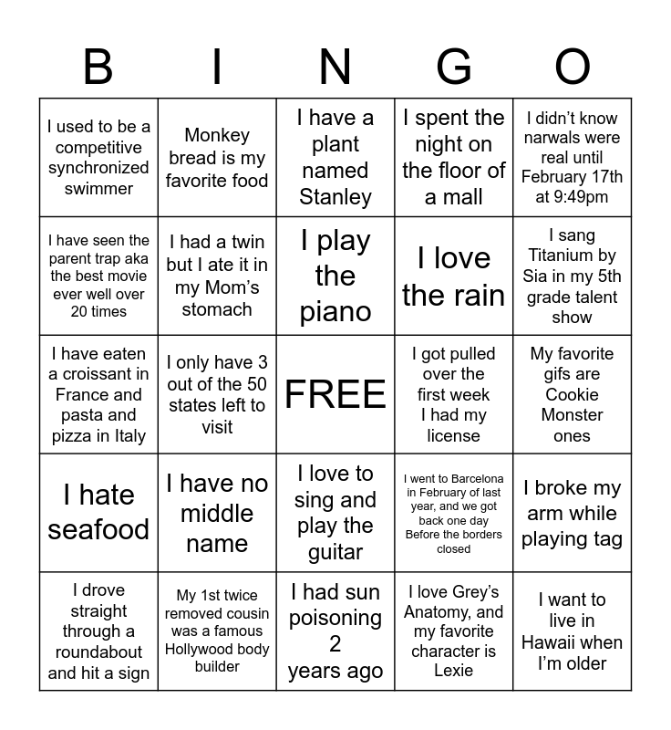 This bingo card has a free space and 29 words: I drove straight through a roundabout and hit a sign, I won first place in my 6th grade spelling bee, I only have 3 out of the 50 states left to visit, I get stomach aches after I eat anything, I used to be a competitive synchronized swimmer, I have a plant named Stanley, I had a twin but I ate it in my Mom’s stomach, I have no middle name, I got pulled over the first week I had my license, My 1st twice removed cousin was a famous Hollywood body builder, My favorite gifs are Cookie Monster ones, I want to live in Hawaii when I’m older, I had sun poisoning 2 years ago, I love Grey’s Anatomy, and my favorite character is Lexie, I sang Titanium by Sia in my 5th grade talent show, When I was 6, I face planted into a rock while I was camping, I love to sing and play the guitar, I hate seafood, I didn’t know narwals were real until February 17th at 9:49pm, I have eaten a croissant in France and pasta and pizza in Italy, I went to Barcelona in February of last year, and we got back one day Before the borders closed, I’ve taken a fall into some cactus, I love the rain, I have seen the parent trap aka the best movie ever well over 20 times, I spent the night on the floor of a mall, Monkey bread is my favorite food, I broke my arm while playing tag, I play the piano and I used to play soccer.