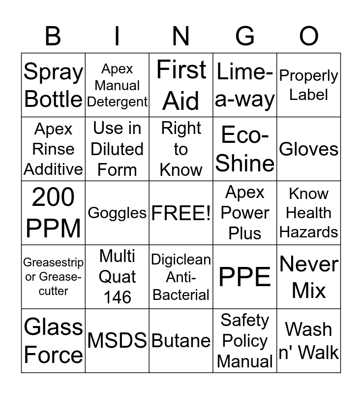 This bingo card has a free space and 24 words: Multi Quat 146, MSDS, Right to Know, Glass Force, Properly Label, Spray Bottle, Apex Rinse Additive, Apex Manual Detergent, Apex Power Plus, Digiclean Anti- Bacterial, Eco-Shine, 200 PPM, PPE, Never Mix, Use in Diluted Form, Safety Policy Manual, Know Health Hazards, First Aid, Gloves, Goggles, Wash n' Walk, Greasestrip or Grease-cutter, Lime-a-way and Butane.