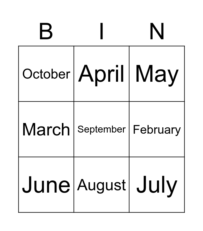 This bingo card has 12 words: January, July, September, February, April, May, August, December, October, March, June and November.