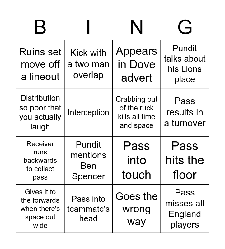 This bingo card has 16 words: Pass into teammate's head, Pass hits the floor, Appears in Dove advert, Ruins set move off a lineout, Receiver runs backwards to collect pass, Kick with a two man overlap, Pass into touch, Goes the wrong way, Distribution so poor that you actually laugh, Interception, Gives it to the forwards when there's space out wide, Pundit talks about his Lions place, Pundit mentions Ben Spencer, Pass results in a turnover, Crabbing out of the ruck kills all time and space and Pass misses all England players.