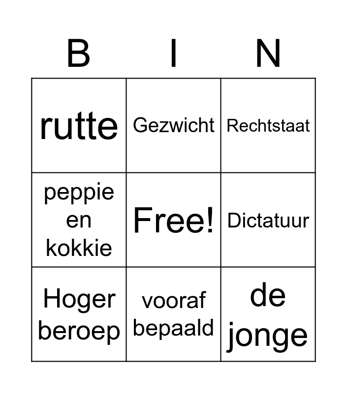 This bingo card has a free space and 8 words: Dictatuur, Rechtstaat, Gezwicht, Hoger beroep, rutte, de jonge, peppie en kokkie and vooraf bepaald.