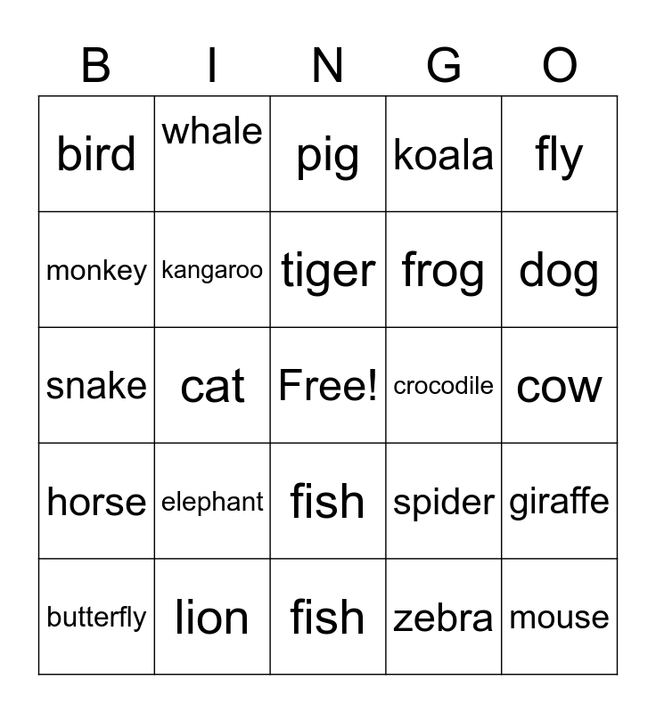 This bingo card has a free space and 24 words: elephant, lion, tiger, butterfly, fly, bird, monkey, whale, crocodile, fish, frog, snake, spider, giraffe, kangaroo, zebra, cow, pig, dog, cat, mouse, horse, koala and fish.