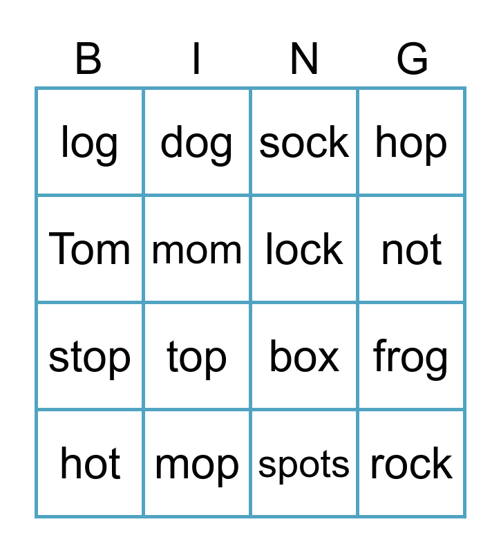 This bingo card has 16 words: mop, frog, sock, log, stop, dog, box, spots, Tom, mom, hot, hop, top, not, lock and rock.