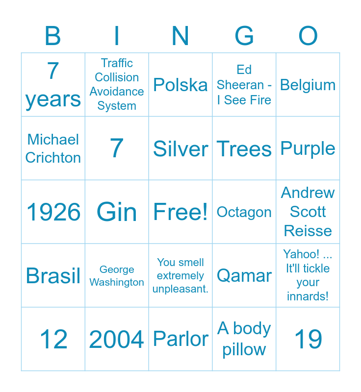This bingo card has a free space and 25 words: George Washington, Parlor, Silver, 12, Belgium, 7 years, Michael Crichton, Traffic Collision Avoidance System, Octagon, You smell extremely unpleasant., Trees, 1926, Qamar, Yahoo! ... It'll tickle your innards!, 7, Bulldog, Andrew Scott Reisse, Polska, Purple, Gin, 19, 2004, Brasil, Ed Sheeran - I See Fire and A body pillow.