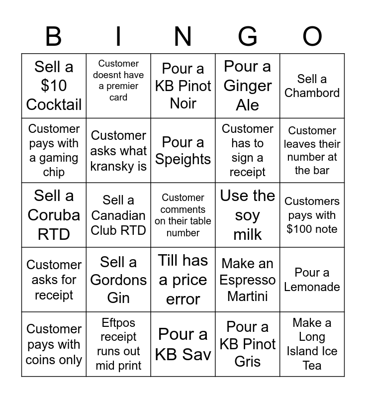 This bingo card has a free space and 99 words: Customer asks to break down money, Pour a Lemon & Paeroa, Make a Royal Flush, Pour a KB Pinot Noir, Post-mix runs out, Customer leaves without their drinks, Sell a Stoneleigh Wild Valley wine, Sell a Fish and Chips, Customer gives you exact cash amount for payment, Pour a Macs Gold, Pour a Coke 0, Sell a CC & Dry Spirit, Make a drink with 2 sugars, Till has a price error, Premier Card is Expired, Sell a $10 Cocktail, Customer doesnt have a premier card, Customer pays with a coupon/gift card, Customer asks for mints, Customer asks what tabbouleh is, Till receipt runs out mid print, Serve a Black Card VIP, Customer takes menu to table, Pour a Waikato, Pour a Coke, Pour a Lemonade, Pour a Speights, Pour a Lion Red, Pour a Panhead APA, Pour a Speights Mid Ale, Pour a KB Sav, Pour a KB Pinot Gris, Pour a KB Chardonnay, Sell a Jim Beam RTD, Sell a Canadian Club RTD, Sell a Coruba RTD, Sell a Beef Scotch, Sell a Chicken Parmigiana, Sell a Smirnoff Vodka, Sell a Gordons Gin, Customer asks for no ice, Customer leaves their number at the bar, Pour a Ginger Ale, Eftpos receipt runs out mid print, Customer asks for a straw, Pour a LF Rose, Pour a Ned Sav, Keg runs out, Sell a JB & Coke Spirit, Sell any spirit with juice, Make a Mojito, Make a Long Island Ice Tea, Make an Espresso Martini, Make a Cosmopolitan, Make a Summer Crush, Premier Card colour does not match the till, Pay out a TAB, Sell a Makers Mark, Customer swaps an item on a food order, Customer leaves their premier card at bar, Add prep instructions to an order, Customer tries to order a shot, Sell a Crown Royal Whiskey, Sell a Good George Gin, Sell a JB Devils Cut, Sell a Chambord, Answer the phone, Make a drink with sweetener, Sell 3 Cocktails in one order/for one group, Customer asks for receipt, Customer asks to do cash out at the bar, Customer has to sign a receipt, Customer pays with a gaming chip, Set up a tab, Serve a single order over $100 before a premier card discount, Customer asks what aubergine is, Customer asks what kransky is, Customer asks for something we dont have, Make something in a blender, Sell a stir-fry with noodles, Use the soy milk, Use decaf coffee, Sell a Church Road wine, Sell an Isaacs Cider, Sell a Malibu, Sell a single shot spirit, Pour a chandy, Sell a stunt double, Customers pays with $100 note, Customer pays with coins only, Customer splits the payment, Customer uses points, Sell Go Nuts, Successfully use More To Come and Last Order, Sell a mocktail, Customer asks for sauce, Customer removes something from food, Sell an Oyster Bay wine and Sell a "proper" coffee in a mug.
