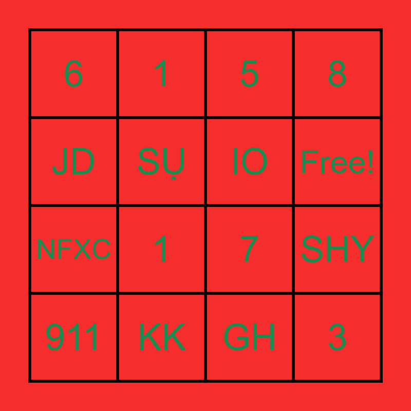 This bingo card has 18 words: 1, 3, 5, 6, 7, 8, 911, 1, Free!, NFXC, GH, JD, SHY, SỤ, IO, MH, KK and KK.