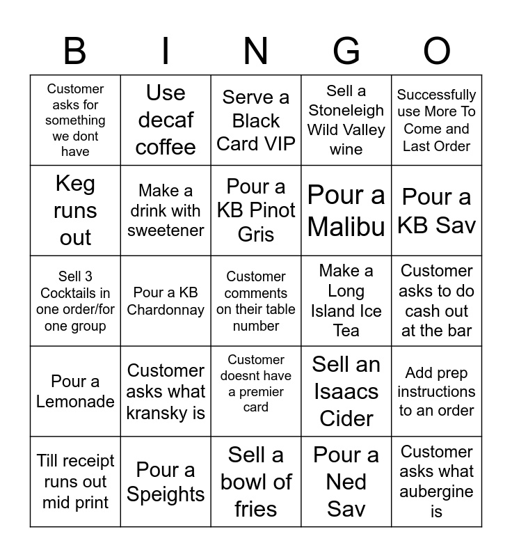 This bingo card has a free space and 114 words: Customer asks to break down money, Pour a Lemon & Paeroa, Make a Royal Flush, Pour a KB Pinot Noir, Post-mix runs out, Customer leaves without their drinks, Sell a Stoneleigh Wild Valley wine, Sell a Fish and Chips, Customer gives you exact cash amount for payment, Pour a Macs Gold, Pour a Coke 0, Sell a CC & Dry Spirit, Make a drink with 2 sugars, Till has a price error, Premier Card is Expired, Sell a $10 Cocktail, Customer doesnt have a premier card, Customer pays with a coupon/gift card, Customer asks for mints, Customer asks what tabbouleh is, Till receipt runs out mid print, Serve a Black Card VIP, Customer takes menu to table, Pour a Waikato, Pour a Coke, Pour a Lemonade, Pour a Speights, Pour a Lion Red, Pour a Panhead APA, Pour a Speights Mid Ale, Pour a KB Sav, Pour a KB Pinot Gris, Pour a KB Chardonnay, Sell a Jim Beam RTD, Sell a Canadian Club RTD, Sell a Coruba RTD, Sell a Beef Scotch, Sell a Chicken Parmigiana, Sell a Smirnoff Vodka, Sell a Gordons Gin, Customer asks for no ice, Customer leaves their number at the bar, Pour a Ginger Ale, Eftpos receipt runs out mid print, Customer asks for a straw, Pour a LF Rose, Pour a Ned Sav, Keg runs out, Sell a JB & Coke Spirit, Sell any spirit with juice, Make a Mojito, Make a Long Island Ice Tea, Make an Espresso Martini, Make a Cosmopolitan, Make a Summer Crush, Premier Card colour does not match the till, Pay out a TAB, Sell a Makers Mark, Customer swaps an item on a food order, Customer leaves their premier card at bar, Add prep instructions to an order, Customer tries to order a shot, Sell a Crown Royal Whiskey, Sell a Good George Gin, Sell a JB Devils Cut, Pour a Chambord, Answer the phone, Make a drink with sweetener, Sell 3 Cocktails in one order/for one group, Customer asks for receipt, Customer asks to do cash out at the bar, Customer has to sign a receipt, Customer pays with a gaming chip, Set up a tab, Serve a single order over $100 before a premier card discount, Customer asks what aubergine is, Customer asks what kransky is, Customer asks for something we dont have, Make something in a blender, Sell a stir-fry with noodles, Use the soy milk, Use decaf coffee, Sell a Church Road wine, Sell an Isaacs Cider, Pour a Malibu, Sell a single shot spirit, Pour a chandy, Sell a stunt double, Customers pays with $100 note, Customer pays with coins only, Customer splits the payment, Customer uses points, Sell Go Nuts, Successfully use More To Come and Last Order, Sell a mocktail, Customer asks for sauce, Customer removes something from food, Sell an Oyster Bay wine, Sell a "proper" coffee in a mug, Pour a Midori, Pour a Baileys, Pour a Kahlua, Pour a Glenfiddich, Pour an Appletons, Pour a Bacardi Spiced, Add a fried egg to an order, Sell a garlic bread, Sell a bowl of fries, Sell a bottled water, Sell food to a platinum card, Customers change is only a note, Customers change is only a coin, Customer asks for lemon and Customer asks for lime.