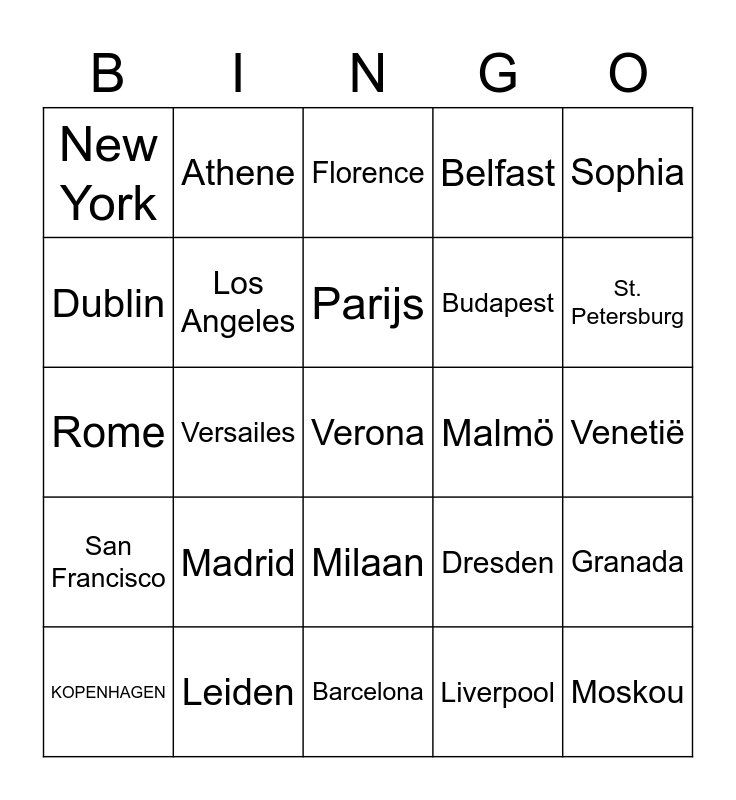 This bingo card has 25 words: Madrid, Barcelona, Parijs, KOPENHAGEN, Sophia, New York, Dublin, Athene, Malmö, Milaan, Budapest, Rome, Dresden, Granada, Los Angeles, Moskou, Venetië, Florence, St. Petersburg, Versailes, Verona, Leiden, San Francisco, Belfast and Liverpool.