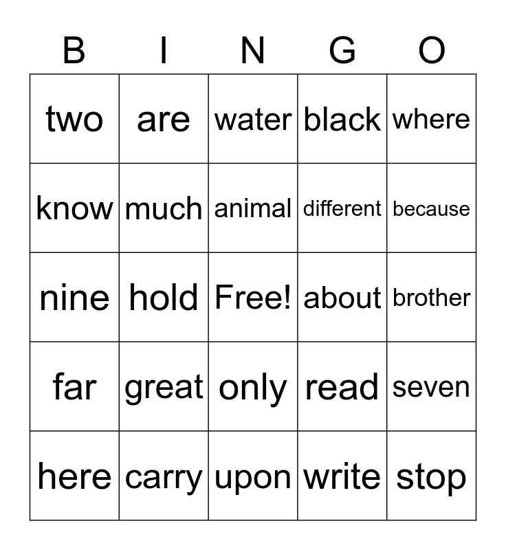 This bingo card has a free space and 24 words: great, carry, animal, here, where, two, know, are, about, only, different, nine, read, seven, much, write, brother, water, because, hold, stop, far, black and upon.