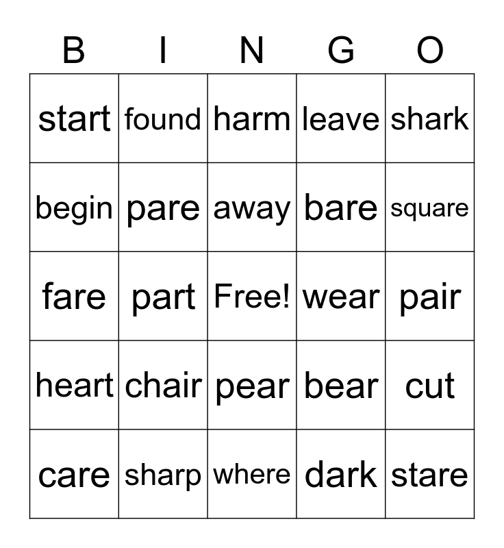 This bingo card has a free space and 29 words: care, hair, part, fair, start, harm, pare, chair, wear, sharp, pair, stare, where, dark, square, hare, pear, heart, shark, fare, bear, stair, bare, begin, leave, found, cut, away and along.