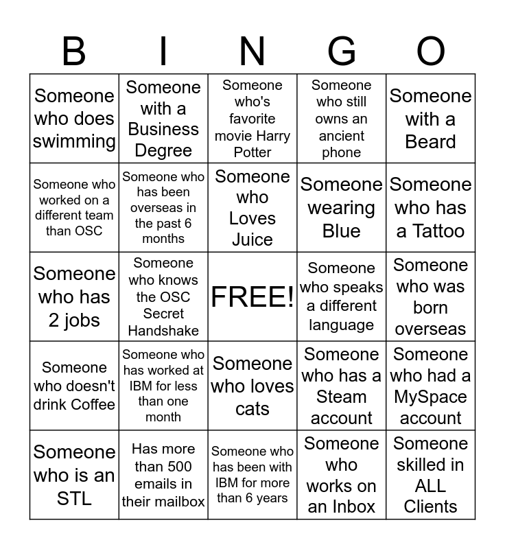 This bingo card has a free space and 24 words: Someone who has worked at IBM for less than one month, Has more than 500 emails in their mailbox, Someone who Loves Juice, Someone who is an STL, Someone with a Beard, Someone who does swimming, Someone who worked on a different team than OSC, Someone with a Business Degree, Someone who speaks a different language, Someone who loves cats, Someone wearing Blue, Someone who has 2 jobs, Someone who has a Steam account, Someone who had a MySpace account, Someone who has been overseas in the past 6 months, Someone who works on an Inbox, Someone who was born overseas, Someone who's favorite movie Harry Potter, Someone who has a Tattoo, Someone who knows the OSC Secret Handshake, Someone skilled in ALL Clients, Someone who doesn't drink Coffee, Someone who still owns an ancient phone and Someone who has been with IBM for more than 6 years.
