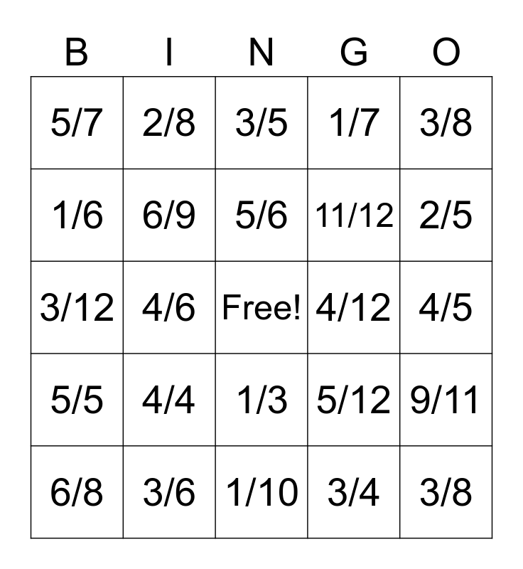 This bingo card has a free space and 24 words: 4/4, 3/6, 5/6, 6/8, 3/8, 5/7, 1/6, 2/8, 4/12, 1/3, 11/12, 3/12, 5/12, 9/11, 6/9, 3/4, 4/5, 3/5, 2/5, 4/6, 3/8, 5/5, 1/7 and 1/10.