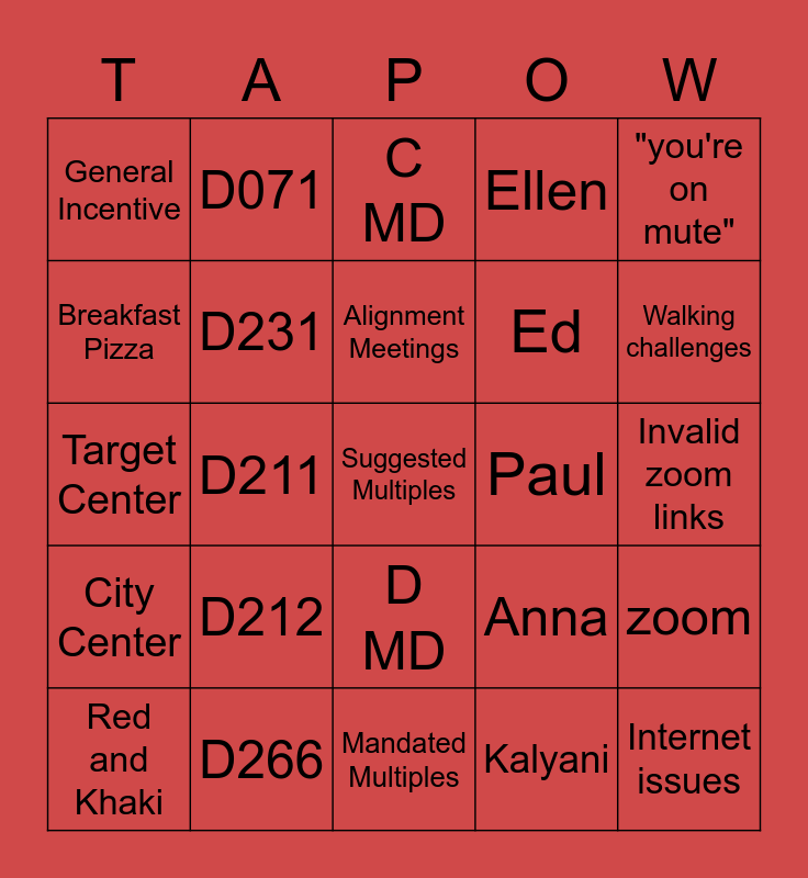 This bingo card has 67 words: Cornell, D055, Pricing, Kalyani, zoom, Green and the grain, D071, promotion, Ed, Kids in the background, Red and Khaki, D210, D MD, Ellen, barking dog, Breakfast Pizza, D211, C MD, JO'C, "you're on mute", City Center, D212, Alignment Meetings, Pat, "can you see my screen", TPS, D213, Incremental Sales, Paul, Scavenger hunts, Target Center, D216, D Rate, Riley D/A, Internet issues, Fall National, D218, Mandated Multiples, Anna, Walking challenges, Bullseye, D231, Suggested Multiples, Bre, Virtual happy hours, Skyway, D261, BOGO, Marissa, Invalid zoom links, General Incentive, D267, LPED, Jake, Blue Screens, Minneapolis, D270, 2x3 Signs, Ryan, Starbucks, D266, 7x11 Signs, Chase, 1375, D284, Ivy and Tim.