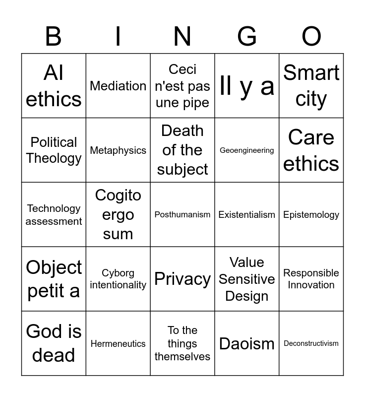 This bingo card has a free space and 24 words: Cyborg intentionality, Hermeneutics, Death of the subject, God is dead, Smart city, AI ethics, Political Theology, Mediation, Existentialism, Privacy, Geoengineering, Technology assessment, Value Sensitive Design, Responsible Innovation, Metaphysics, Daoism, Epistemology, Ceci n'est pas une pipe, Care ethics, Cogito ergo sum, Deconstructivism, Object petit a, Il y a and To the things themselves.
