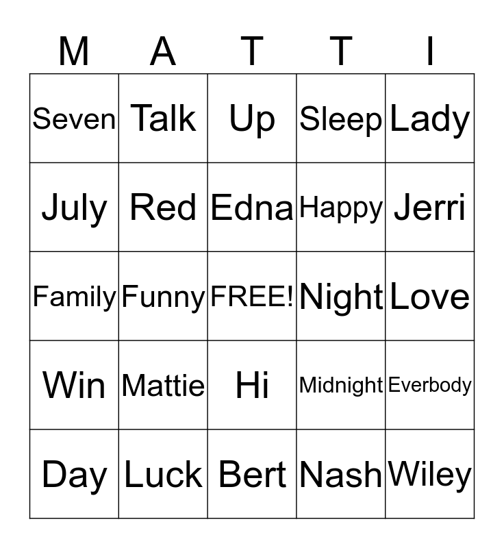 This bingo card has a free space and 24 words: Mattie, Luck, Edna, Day, Lady, Seven, July, Talk, Night, Hi, Happy, Family, Midnight, Everbody, Red, Nash, Love, Up, Jerri, Funny, Wiley, Win, Sleep and Bert.