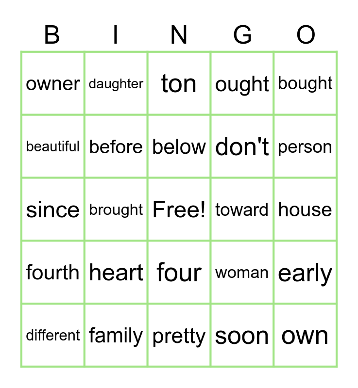 This bingo card has a free space and 39 words: several, thought, three, before, different, four, below, between, bought, fourth, brought, ought, own, house, toward, heart, learn, owner, learned, woman, beautiful, pretty, don't, person, women, father, mother, sister, brother, daughter, son, won, ton, family, soon, almost, early, since and families.