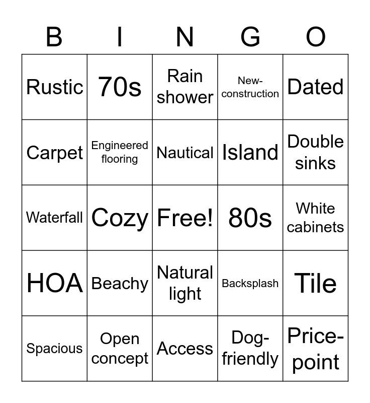 This bingo card has a free space and 24 words: Beachy, Open concept, Nautical, Spacious, Dated, Rustic, Carpet, 70s, 80s, Natural light, Island, Waterfall, Backsplash, Tile, Engineered flooring, Dog-friendly, White cabinets, Rain shower, Double sinks, Cozy, Price- point, HOA, New-construction and Access.