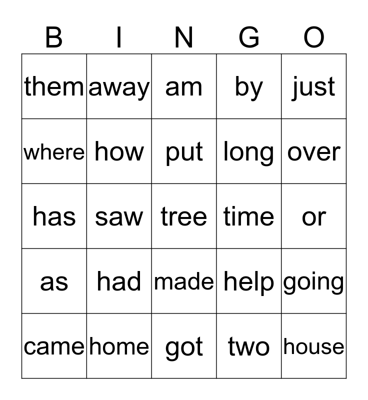 This bingo card has 25 words: had, got, put, came, just, them, where, away, time, made, long, has, help, going, how, house, or, am, over, saw, tree, home, as, by and two.