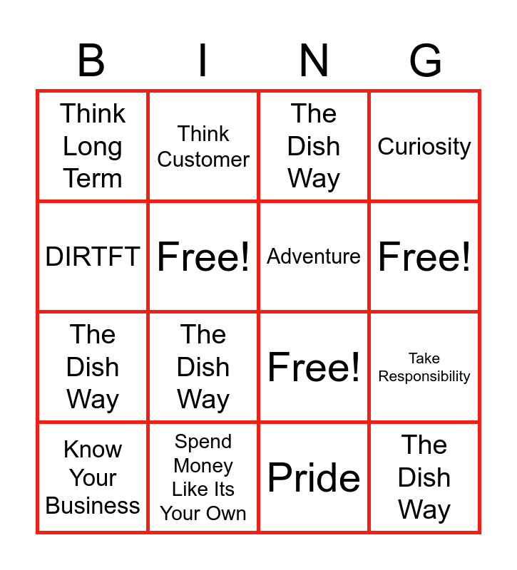 This bingo card has 17 words: Pride, Know Your Business, The Dish Way, Think Long Term, The Dish Way, Curiosity, Take Responsibility, Adventure, Free!, Free!, Spend Money Like Its Your Own, Free!, DIRTFT, Think Customer, The Dish Way, Winning and The Dish Way.