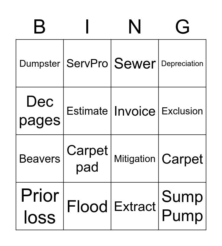 This bingo card has 16 words: Flood, Carpet, Sewer, Dumpster, Beavers, ServPro, Mitigation, Extract, Dec pages, Estimate, Prior loss, Depreciation, Carpet pad, Exclusion, Invoice and Sump Pump.