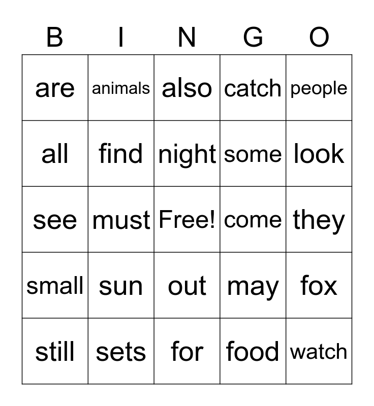 This bingo card has a free space and 24 words: sun, sets, night, still, people, are, all, animals, come, out, some, see, may, fox, find, food, they, also, look, must, watch, small, catch and for.