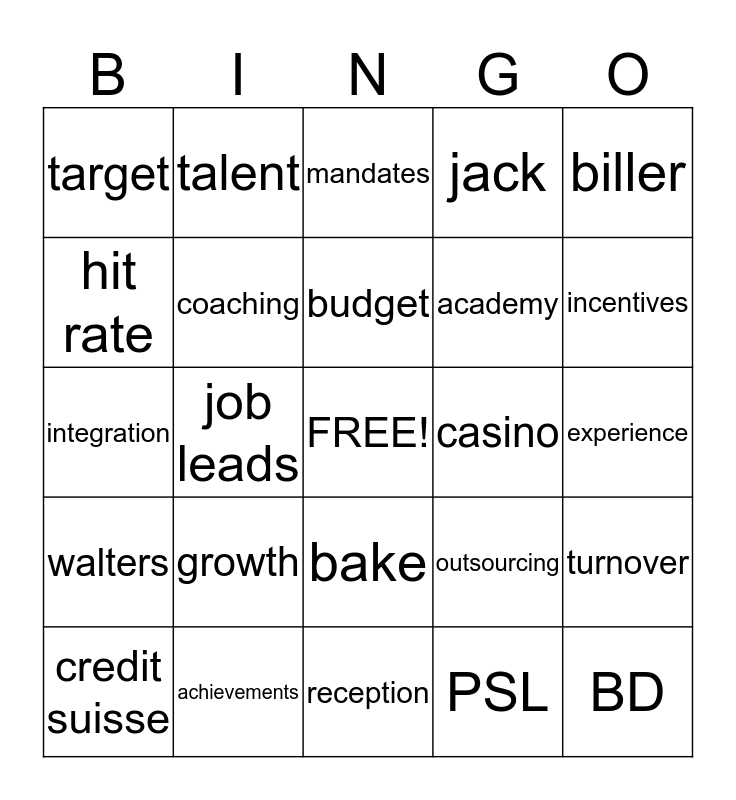 This bingo card has a free space and 24 words: growth, achievements, budget, credit suisse, biller, target, hit rate, talent, casino, bake, academy, integration, outsourcing, turnover, coaching, PSL, experience, mandates, incentives, job leads, BD, walters, jack and reception.