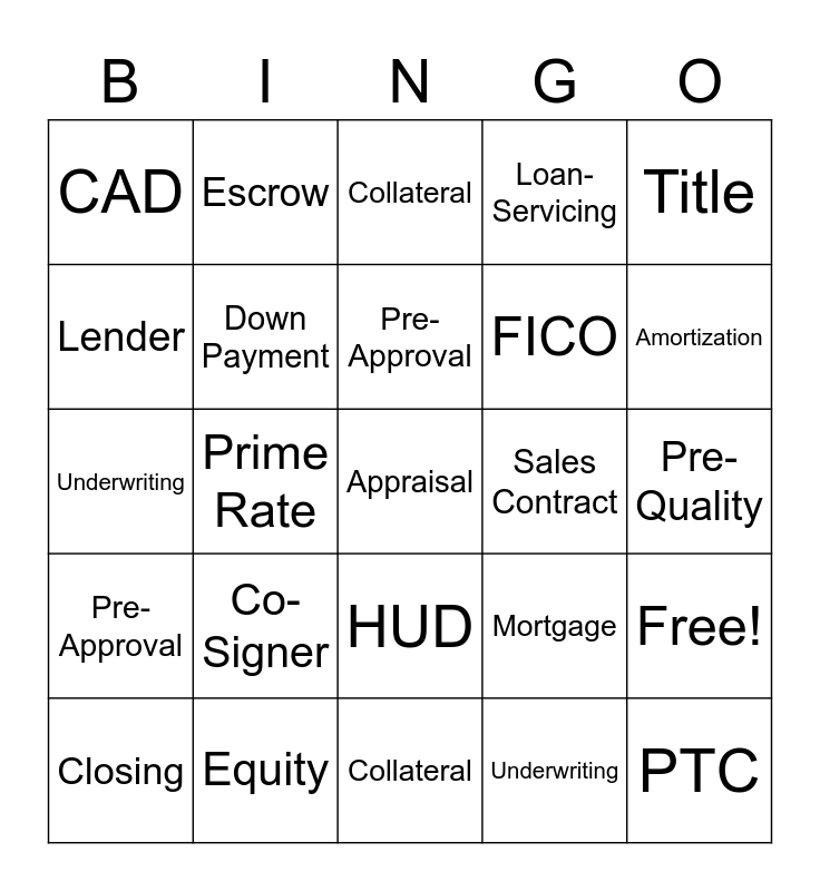 This bingo card has 51 words: Amortization, Appraisal, Closing, Collateral, Co-Signer, Credit Score, Escrow, FHA, Lender, Equity, Down Payment, Loan-Servicing, Free!, Mortgage, Net-Income, Pre-Quality, Pre-Approval, Sales Contract, Servicing, Title, Prime Rate, Underwriting, CAD, FICO, HUD, PTC, Amortization, Appraisal, Closing, Collateral, Co-Signer, Credit Score, Escrow, FHA, Lender, Equity, Down Payment, Loan-Servicing, Mortgage, Net-Income, Pre-Quality, Pre-Approval, Sales Contract, Servicing, Title, Prime Rate, Underwriting, CAD, FICO, HUD and PTC.