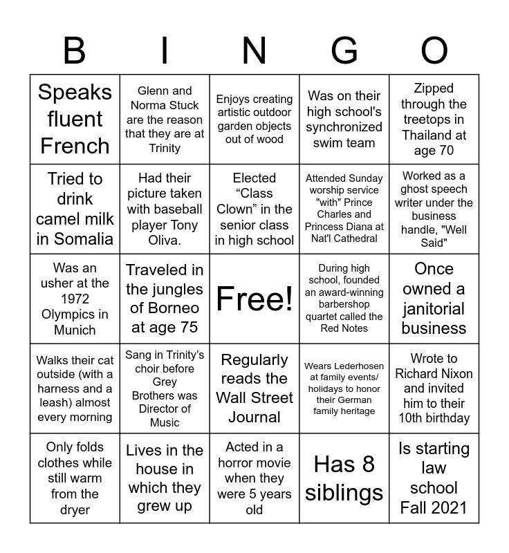 This bingo card has a free space and 57 words: Youngest of 4 children, Only folds clothes while still warm from the dryer, Brush with fame: handed a cup of coffee to James Taylor, Speaks fluent French, Acted in a horror movie when they were 5 years old, Is obsessed with Scottish Highland cows, Had their picture taken with baseball player Tony Oliva., Willingly jumped out of an airplane at 13,500 feet, Attended Sunday worship service "with" Prince Charles and Princess Diana at Nat'l Cathedral, First car was a 1972 Mustang., Was on their high school's synchronized swim team, Flew a cat to Canada, For many years, dressed up as a cocktail as their Halloween costume, Was voted “life of the party” in their high school senior hall of fame, Is a (VERY) amateur woodworker, Hiked to the bottom of Havasupai canyon at age 15, Zipped through the treetops in Thailand at age 70, Traveled in the jungles of Borneo at age 75, Was conceived in Uganda., Is starting law school Fall 2021, During high school, founded an award-winning barbershop quartet called the Red Notes, Was an AFS (American Field Service) Student in High school, and spent 3 months in Ecuador, Wears Lederhosen at family events/ holidays to honor their German family heritage, Enjoys creating artistic outdoor garden objects out of wood, Was a semi-pro volleyball player (Hapa Haoles), Elected “Class Clown” in the senior class in high school, Partner in a catering company, The Party People, Never attended the Indy 500, Worked as a ghost speech writer under the business handle, "Well Said", Received 2 MVP awards in their Jr. High church basketball league, Ran a booth at their high school fair in celebration of the 1st Earth Day, 1970, At 19, traveled around the world in 4 months as part of the World Campus Afloat program, Became a Life Master in duplicate bridge at age 22, Die-hard Celtics fan, Once owned a janitorial business, Tried to drink camel milk in Somalia, Saw Janis Joplin with Big Brother and the Holding Company; concert opened by Jefferson Airplane, Was an usher at the 1972 Olympics in Munich, Got a ride home from Shakespeare's Twelfth Night from Sir Ian McKellen, Walks their cat outside (with a harness and a leash) almost every morning, Glenn and Norma Stuck are the reason that they are at Trinity, Regularly reads the Wall Street Journal, First ‘behind the wheel’ experience was driving a forklift, Won business school typing contest ($10 prize) with speed of 82 wpm, Danced as The Head in the Lion Dance during a Chinese New Year celebration, Has sung for the Warriors and the A’s, Sang in Trinity’s choir before Grey Brothers was Director of Music, Lives in the house in which they grew up, Born in Cuba and immigrated to CA at 3 days old, Attended Catholic school grades 1-12 and in 8th grade was voted class clown, In a previous career, sold supercomputers to Boeing Military Airplane Division in Seattle, Has 8 siblings, Completed two marathons (and a bunch of 1/2 marathons), Was a service “brat” (first Navy then Air Force), At age 9, wanted to be a nun, Wrote to Richard Nixon and invited him to their 10th birthday and Won “outstanding senior girl” award the year she graduated high school.