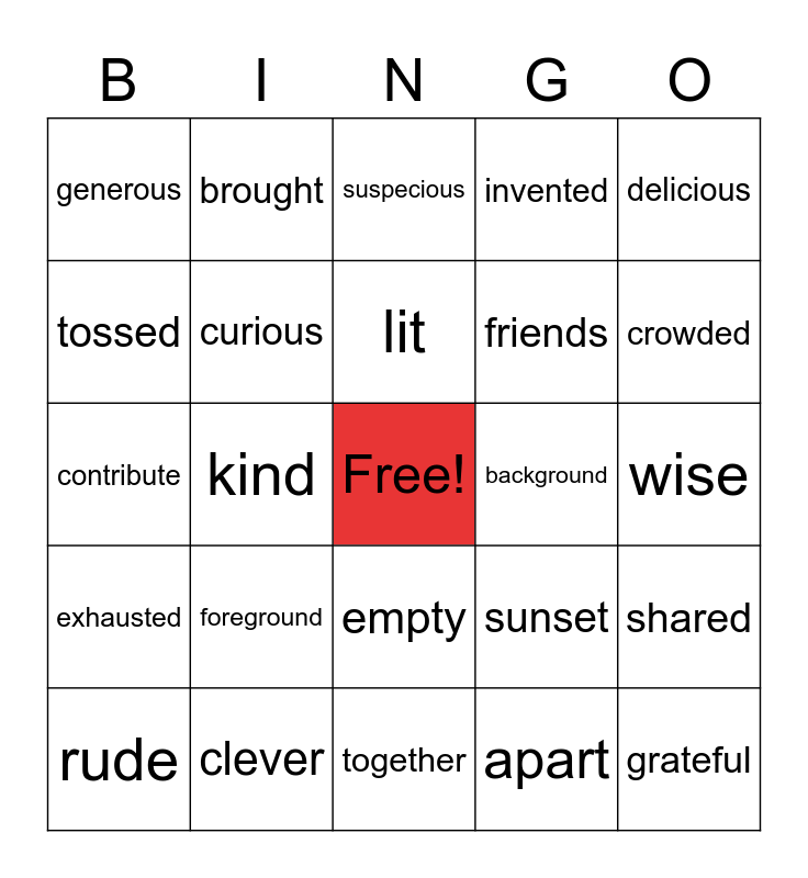 This bingo card has a free space and 29 words: rude, polite, kind, inspiring, generous, suspecious, curious, foreground, background, clever, wise, grateful, together, apart, crowded, landscape, empty, exhausted, delicious, contribute, sunset, community, friends, tossed, invented, brought, shared, lit and nutritious.
