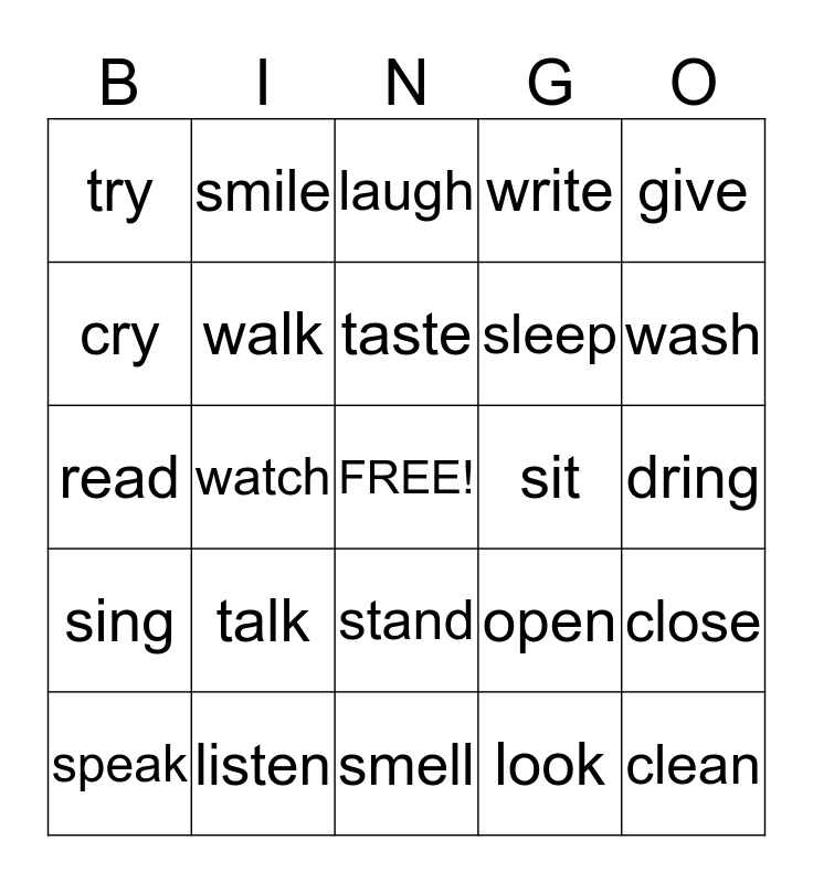 This bingo card has a free space and 24 words: talk, listen, taste, speak, give, try, cry, smile, sit, stand, sleep, read, open, close, walk, look, dring, laugh, wash, watch, clean, sing, write and smell.