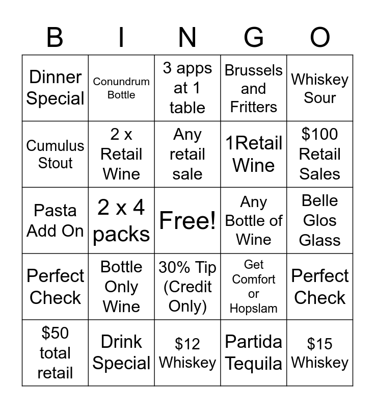 This bingo card has a free space and 29 words: $50 total retail, Perfect Check, 2 x 4 packs, Electric Sunset Shandy, Dinner Special, 3 apps at 1 table, 2 x Retail Wine, Bottle Only Wine, Any Bottle of Wine, Drink Special, Belle Glos Glass, $15 Whiskey, $12 Whiskey, Partida Tequila, $100 Retail Sales, Aztec Old Fashion, 30% Tip (Credit Only), Perfect Check, Whiskey Sour, Pasta Add On, Get Comfort or Hopslam, Single Can Retail, 1Retail Wine, Cumulus Stout, Brussels and Fritters, Conundrum Bottle, Perfect Check, Any retail sale and $13 Whiskey.