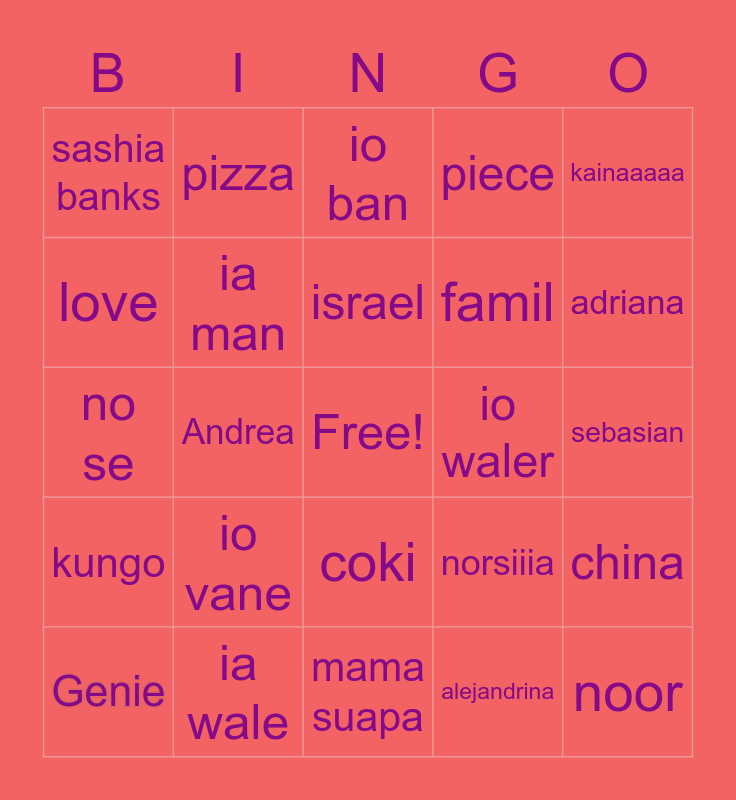 This bingo card has a free space and 29 words: Genie, Nelson, Andrea, ami, sashia banks, io ban, ia man, io vane, io waler, ia wale, sebasian, noor, mama suapa, alejandrina, adriana, saniago, coki, kungo, kainaaaaa, no se, norsiiia, holi, famil, love, piece, pizza, china, israel and egio.