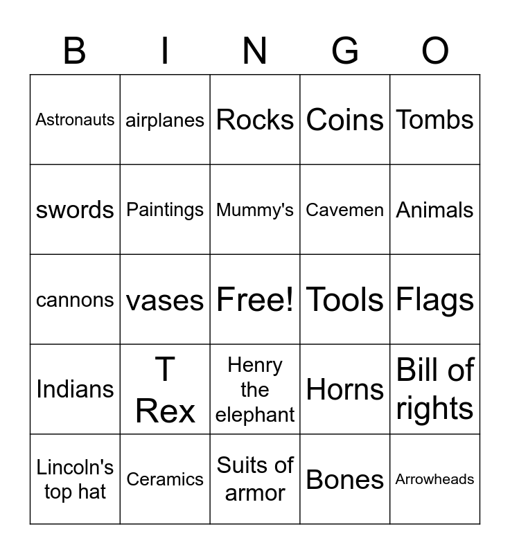 This bingo card has a free space and 24 words: T Rex, Ceramics, Mummy's, Lincoln's top hat, Tombs, Astronauts, swords, airplanes, Tools, Henry the elephant, Cavemen, cannons, Horns, Bill of rights, Paintings, Bones, Flags, Rocks, Animals, vases, Arrowheads, Indians, Coins and Suits of armor.