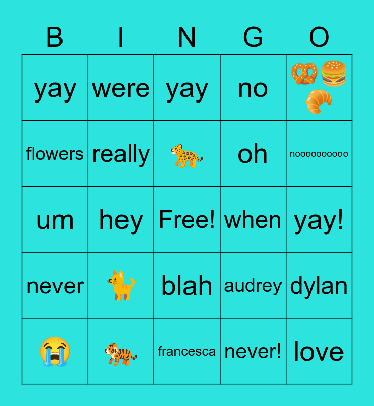 This bingo card has a free space and 24 words: π, π , π, π, π₯¨ππ₯, yay, flowers, were, when, blah, oh, um, audrey, dylan, really, never!, yay!, yay, noooooooooo, hey, love, never, no and francesca.