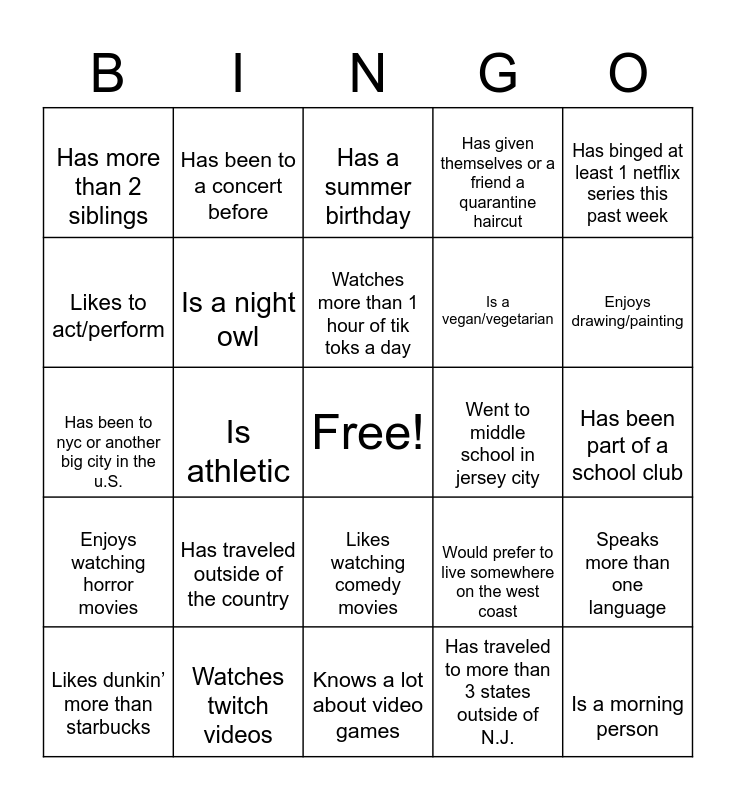 This bingo card has a free space and 24 words: Has traveled outside of the country, Watches twitch videos, Watches more than 1 hour of tik toks a day, Likes dunkin’ more than starbucks, Has binged at least 1 netflix series this past week, Has more than 2 siblings, Likes to act/perform, Has been to a concert before, Went to middle school in jersey city, Likes watching comedy movies, Is a vegan/vegetarian, Has been to nyc or another big city in the u.S., Would prefer to live somewhere on the west coast, Speaks more than one language, Is a night owl, Has traveled to more than 3 states outside of N.J., Has been part of a school club, Has a summer birthday, Enjoys drawing/painting, Is athletic, Is a morning person, Enjoys watching horror movies, Has given themselves or a friend a quarantine haircut and Knows a lot about video games.