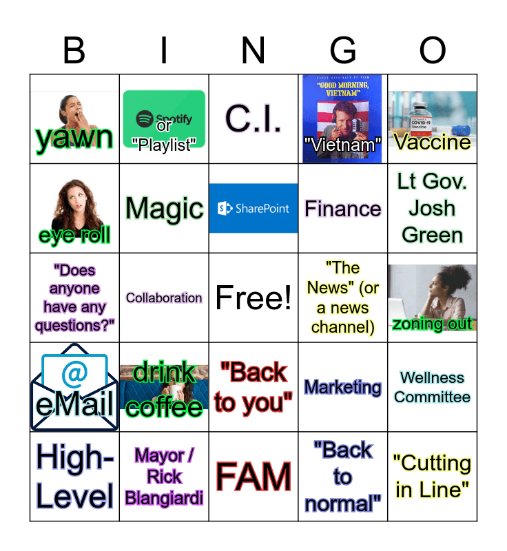 This bingo card has 12 images, a free space and 28 words: High-Level, "When we're all back in the office", Collaboration, COVID, yawn, C.I., Magic, drink coffee, "The News" (or a news channel), Mayor / Rick Blangiardi, zoning out, "Cutting in Line", FAM, "Back to normal", Lt Gov. Josh Green, Biting/ chewing lips, "Back to you", eMail, Vaccine, "Does anyone have any questions?", Marketing, "Jazz", Finance, eye roll, "Vietnam", or "Playlist", Wellness Committee and cat/dog.