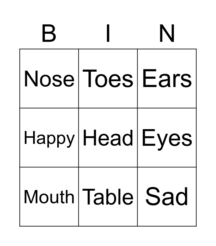 This bingo card has a free space and 8 words: Eyes, Ears, Toes, Mouth, Nose, Sad, Happy and Table.