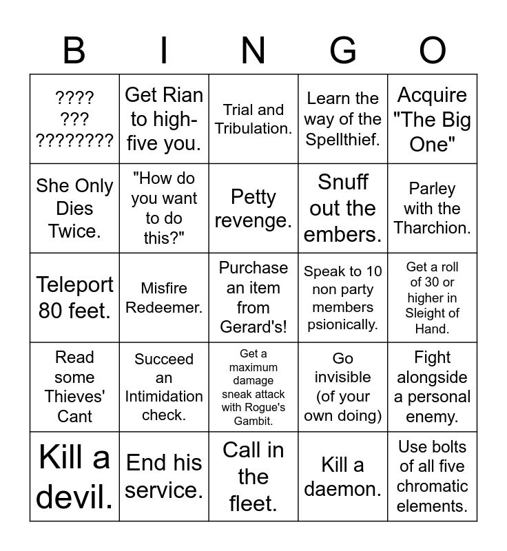 This bingo card has a free space and 24 words: Succeed an Intimidation check., End his service., Petty revenge., Kill a devil., Acquire "The Big One", ???? ??? ????????, She Only Dies Twice., Get Rian to high-five you., Speak to 10 non party members psionically., Get a maximum damage sneak attack with Rogue's Gambit., Snuff out the embers., Teleport 80 feet., Go invisible (of your own doing), Fight alongside a personal enemy., "How do you want to do this?", Kill a daemon., Get a roll of 30 or higher in Sleight of Hand., Trial and Tribulation., Parley with the Tharchion., Misfire Redeemer., Use bolts of all five chromatic elements., Read some Thieves' Cant, Learn the way of the Spellthief. and Call in the fleet..