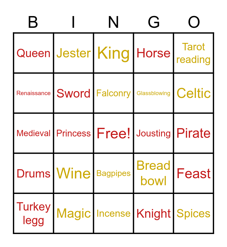 This bingo card has a free space and 29 words: Turkey legg, Fairy, Princess, Prince, Queen, King, Sword, Wine, Jousting, Magic, Pirate, Spices, Incense, Knight, Celtic, Belly dancing, Bagpipes, Drums, Tarot reading, Medieval, Bread bowl, Blacksmith, Glassblowing, Renaissance, Horse, Jester, Feast, Falconry and Axe throwing.