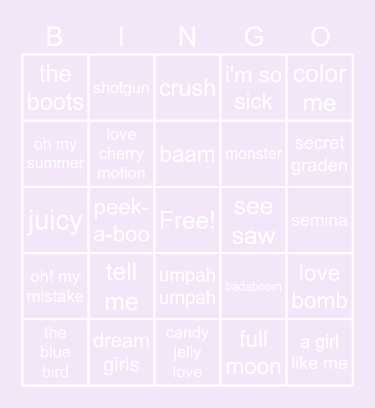 This bingo card has a free space and 24 words: tell me, dream girls, baam, the blue bird, color me, the boots, oh my summer, shotgun, see saw, umpah umpah, monster, juicy, badaboom, love bomb, love cherry motion, full moon, semina, crush, secret graden, peek-a-boo, a girl like me, oh! my mistake, i'm so sick and candy jelly love.