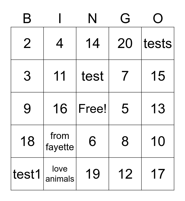 This bingo card has a free space and 24 words: from fayette, love animals, test, test1, tests, 2, 3, 4, 5, 6, 7, 9, 8, 10, 11, 12, 13, 14, 15, 16, 17, 18, 20 and 19.