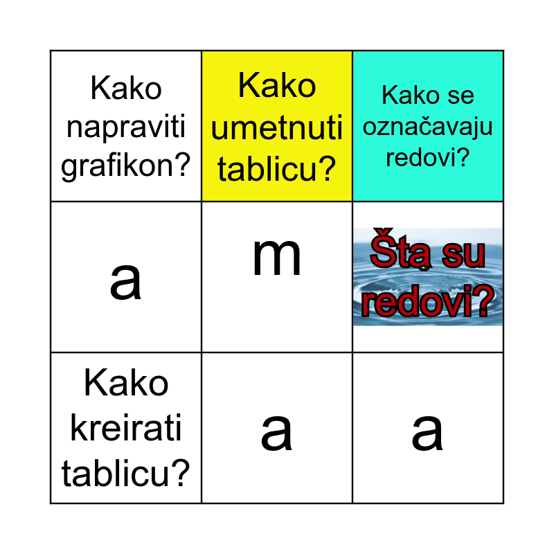 This bingo card has 1 images, a free space and 8 words: Šta su redovi?, Kako se označavaju redovi?, Kako umetnuti tablicu?, Kako kreirati tablicu?, Kako napraviti grafikon?, a, a and a.