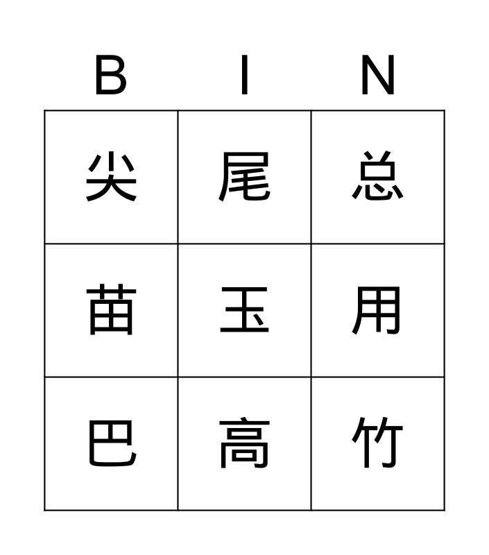 This bingo card has a free space and 8 words: 用, 总, 尾, 巴, 尖, 竹, 苗 and 高.