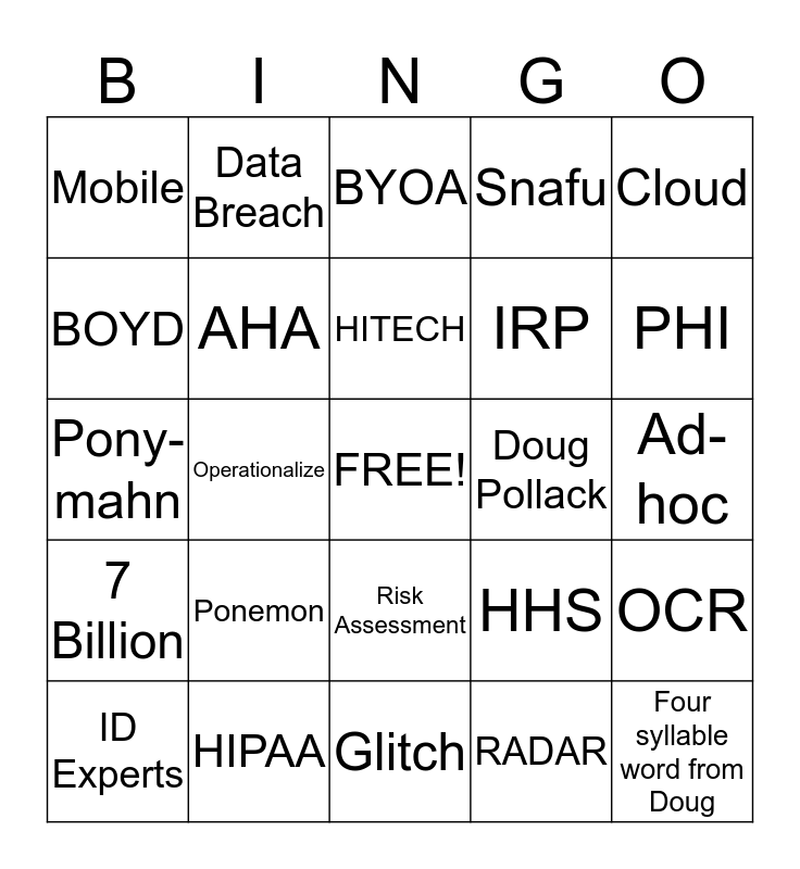 This bingo card has a free space and 24 words: Ponemon, HIPAA, HITECH, ID Experts, Cloud, Mobile, BOYD, Data Breach, Doug Pollack, Risk Assessment, IRP, Pony-mahn, HHS, OCR, AHA, RADAR, Ad-hoc, BYOA, PHI, Operationalize, Four syllable word from Doug, 7 Billion, Snafu and Glitch.