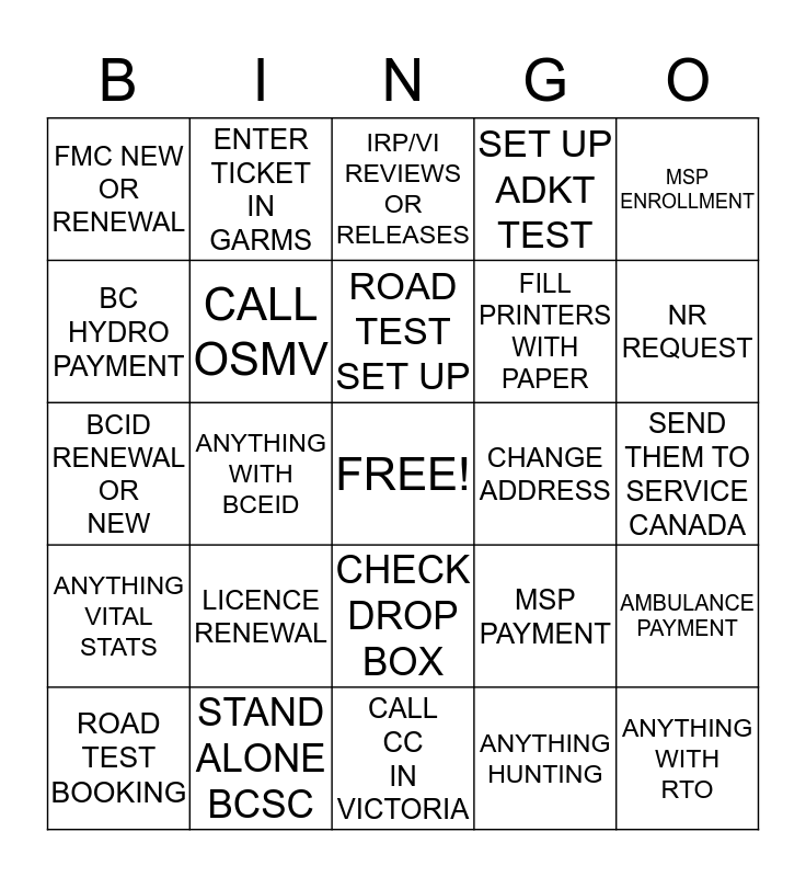 This bingo card has a free space and 24 words: LICENCE RENEWAL, STAND ALONE BCSC, ROAD TEST SET UP, ROAD TEST BOOKING, MSP ENROLLMENT, FMC NEW OR RENEWAL, BC HYDRO PAYMENT, ENTER TICKET IN GARMS, CHANGE ADDRESS, CHECK DROP BOX, FILL PRINTERS WITH PAPER, BCID RENEWAL OR NEW, MSP PAYMENT, AMBULANCE PAYMENT, CALL OSMV, ANYTHING HUNTING, SEND THEM TO SERVICE CANADA, IRP/VI REVIEWS OR RELEASES, NR REQUEST, ANYTHING WITH BCEID, ANYTHING WITH RTO, ANYTHING VITAL STATS, SET UP ADKT TEST and CALL CC IN VICTORIA.