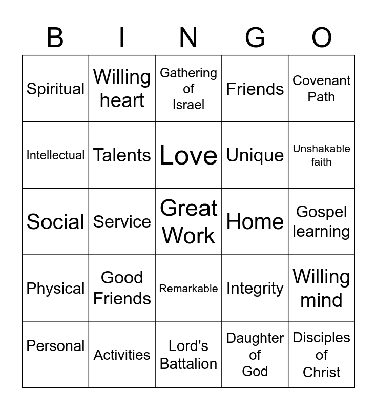 This bingo card has a free space and 29 words: Personal, Let your light shine, Service, Disciples of Christ, Spiritual, Gathering of Israel, Talents, Good Friends, Home, Activities, Gospel learning, Disciples of Christ, Lord's Battalion, Daughter of God, Unshakable faith, Family, Remarkable, Physical, Covenant Path, Social, Integrity, Pray, Unique, Intellectual, Friends, Willing heart, Willing mind, Love and Charity.